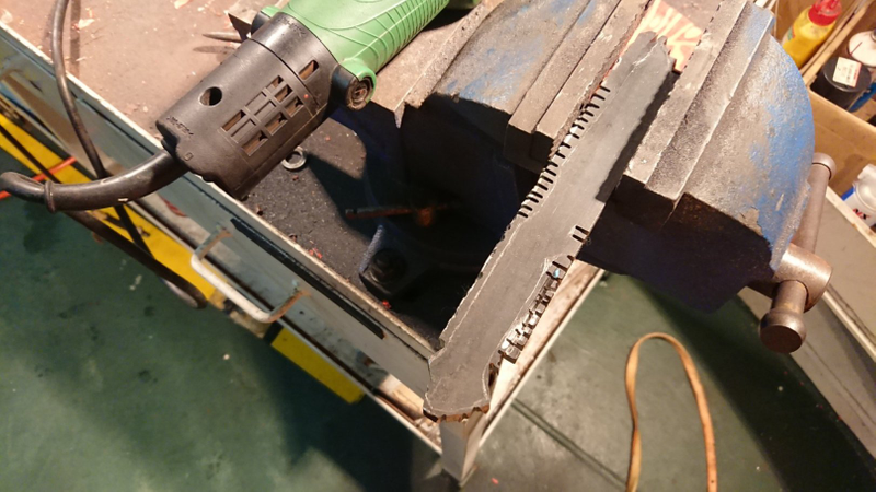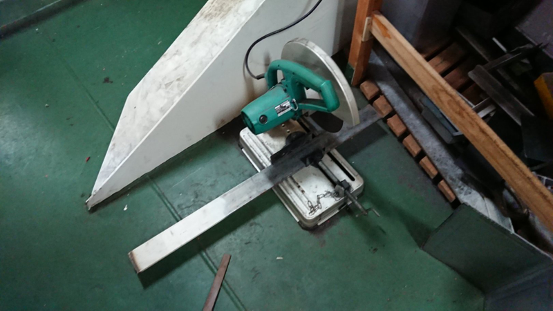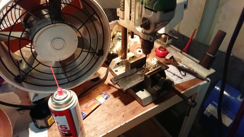 長さと厚みががありすぎて高速切断機でも大変だった、、、(柔らかくねーじゃんw)ので、結局ボール盤で穴をあける作戦に変更。