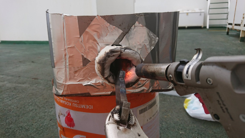 ※ちなみに写真のようにただあぶるだけでは赤熱しません。家で使っているフライパンが赤熱しないのはなぜか。ガスコンロでも1200℃はいくはず。それは、面積が広く放熱してしまうから。つまり、1000℃の炎であぶっても、鉄は1000℃にはならんのです。1000℃にするには放熱をしない工夫、つまりかまどが必要。
